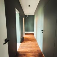 Wnętrze domu zachwyca przestronnym salonem z aneksem kuchennym, który otwiera się na taras przez duże drzwi przesuwne, zapewniając doskonały przepływ między wnętrzem a otoczeniem. Na parterze znajduje się także trzy sypialnie, z czego jedna dysponuje własną łazienką. Z głównej sypialni również można wyjść na przytulne podwórko i pięknie utrzymany ogród.